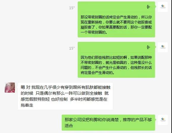 上述案例是一個網絡朋友的咨詢,他的殘肢很長,皮膚也沒問題,其實可以不用裝硅膠套,但當地公司推薦了凝膠套,因為不是帶密封圈加上殘肢又長,就導致他穿假肢時總是滑動,現在很苦惱,打算重新換腔。